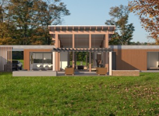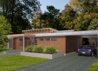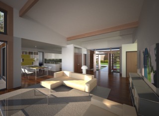 A smaller single story home for small families or down sizers. It has a large open space as the central living area. Flat roof or pitched roofs both work well with this design.
